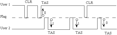 type FLAGTYPE is range 0..1; task CONTROL_FLAG is entry TAS (TEST_RESULT: out FLAGTYPE); entry CLR; end CONTROL_FLAG; task body CONTROL_FLAG is FLAG:FLAGTYPE; begin loop select accept TAS(TEST_RESULT: out FLAGTYPE) do TEST_RESULT := FLAG; FLAG := 1; end; or accept CLR do FLAG := 0; end; end select end loop end CONTROL_FLAG