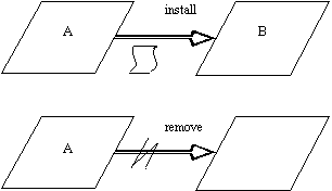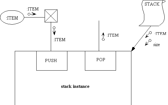 In looking at the above diagram, it is bothersome that it does not represent the syntax of Ada. In Ada, the generic takes a parameter very much like a function takes a parameter. Then the generic is instantiated with the new keyword. As one step toward this kind of representation, we create a new convention for instantiation, using an arrow with an unfilled head as below: