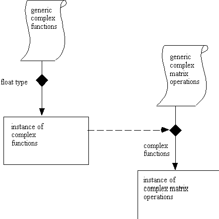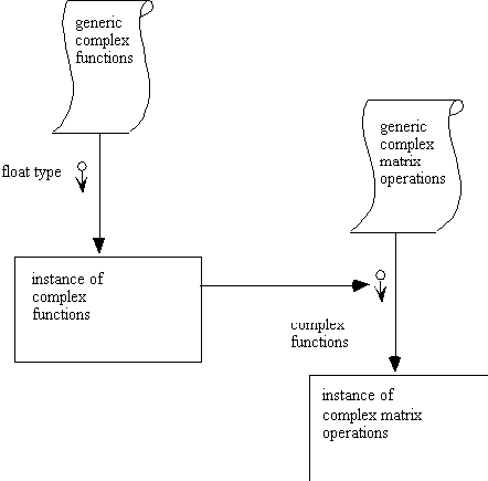 generic type FLOAT_TYPE is digits <>; package GENERIC_COMPLEX_FUNCTIONS is type COMPLEX is record REAL : FLOAT_TYPE; IMAG : FLOAT_TYPE; end record; function "-" (RIGHT : COMPLEX) return COMPLEX; function "+" (LEFT, RIGHT : COMPLEX) return COMPLEX; ... end GENERIC_COMPLEX_FUNCTIONS; generic with PACKAGE COMPLEX FUNCTIONS is new GENERIC_COMPLEX_FUNCTIONS(<>); package GENERIC_COMPLEX_MATRIX_OPERATIONS is type COMPLEX_MATRIX is array(positive range <>, positive range <>) of COMPLEX FUNCTIONS.COMPLEX; function "*" (LEFT : COMPLEX_FUNCTIONS.COMPLEX; RIGHT : COMPLEX_MATRIX) return COMPLEX_MATRIX; end GENERIC_COMPLEX_MATRIX_OPERATIONS; package SHORT_COMPLEX_PKG is NEW GENERIC_COMPLEX_FUNCTIONS(SHORT_FLOAT); ... package SHORT_COMPLEX_MATRIX_PKG is new GENERIC_COMPLEX_MATRIX_OPERATIONS(SHORT_COMPLEX_PKG);