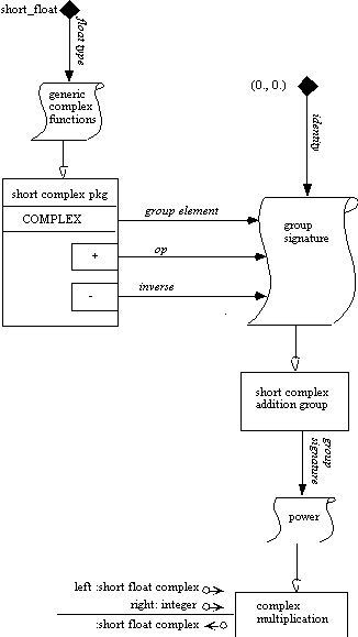generic type GROUP_ELEMENT is private; IDENTITY : CONSTANT GROUP_ELEMENT; with function OP(LEFT, RIGHT : GROUP_ELEMENT) return GROUP_ELEMENT; with function INVERSE(RIGHT : GROUP_ELEMENT) return GROUP_ELEMENT; package GROUP_SIGNATURE is end; generic with package GROUP is new GROUP_SIGNATURE(<>); function POWER(LEFT : GROUP.GROUP_ELEMENT; RIGHT : INTEGER) return GROUP.GROUP_ELEMENT; function POWER(LEFT : GROUP. GROUP_ELEMENT; RIGHT : INTEGER) return GROUP.GROUP_ELEMENT is result : GROUP.GROUP_ELEMENT := IDENTITY; begin for I in 1 .. abs RIGHT loop result := GROUP.OP(RESULT, LEFT); end loop; if RIGHT < 0 then return GROUP.INVERSE(RESULT); else return RESULT; end if; end POWER; package SHORT_COMPLEX_ADDITION_GROUP is new GROUP_SIGNATURE(SHORT_COMPLEX_PKG.COMPLEX, IDENTITY => (0.0, 0.0), OP => SHORT_COMPLEX_PKG."+", INVERSE => SHORT_COMPLEX_PKG."-"); function COMPLEX_MULTIPLICATION is new POWER(SHORT_COMPLEX_ADDITION_GROUP);